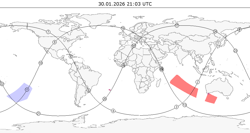 Красным помечены области, в которых PDOP (безразмерная величина, характеризующая уровень ошибки определения местоположения) выше .